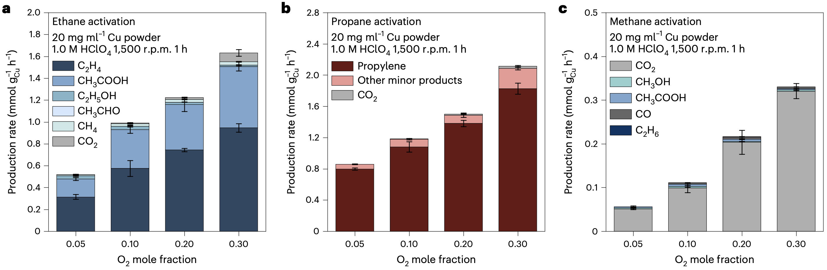 图1.在不同的氧气摩尔分数下乙烷(a)、丙烷(b)和甲烷(c)活化的产物及相应的生成速率