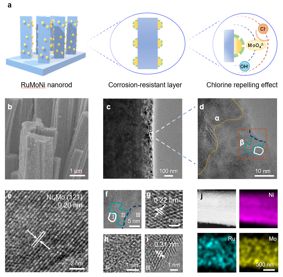 近日,8xbet.com深圳国际研究生院刘碧录教授团队开发了一种高性能、耐腐蚀海水电解催化剂。研究人员通过水热法和电化学活化法制备了钌钼镍(RuMoNi)催化剂,这种催化剂由表面多孔纳米棒阵列组成。高分辨透射电镜表明该催化剂由镍钼合金(Ni4Mo)导电基底、氧化钌/羟基氧化镍(RuO2/NiOOH)活性相和钼酸镍(NiMoO4)抗腐蚀层构成。