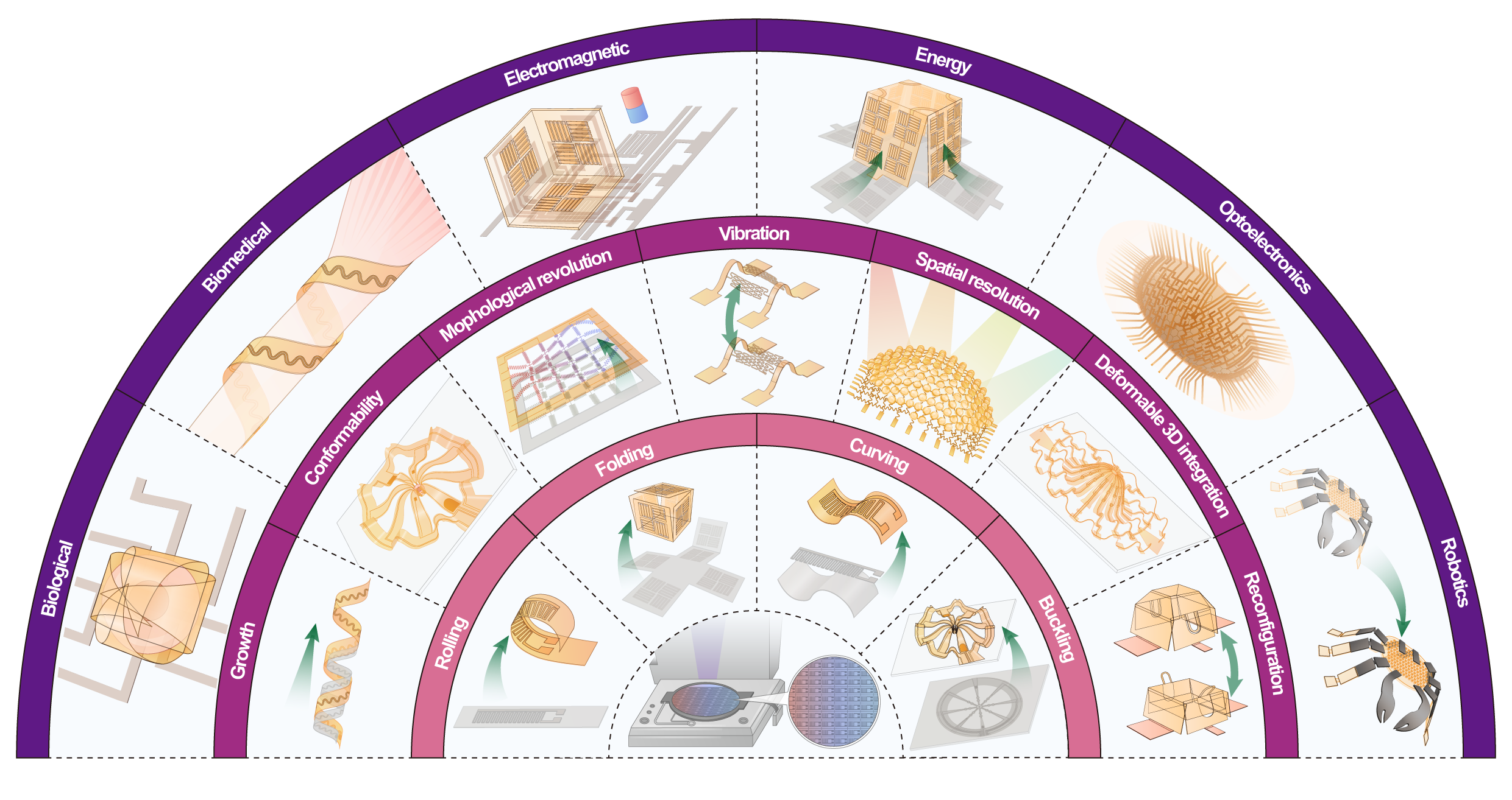 图1.三维柔性电子器件的力学引导组装方法。内圈为四种三维组装方法:弯曲组装、折叠组装、共形组装和屈曲组装;中圈为器件的结构性功能;外圈为三维柔性电子器件在生物/医疗、电磁、能源、光电、机器人等领域的应用