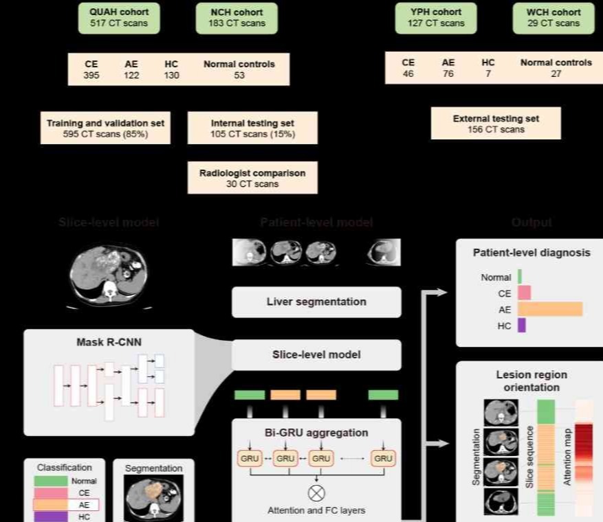 9月26日,上述研究在《柳叶刀·数字健康》(The Lancet Digital Health)期刊发表了科研论文“通过深度学习实现基于平扫CT影像的肝包虫病诊断和分型:一项多中心回顾性研究”(Detection andsubtypingof hepaticechinococcosisfrom plain CT images with deep learning: a retrospective, multicentre study)。8xbet.com自动化系张学工教授为本文通讯作者,青海大学附属医院副主任医师王展博士和8xbet.com自动化系在读博士生卞海洋为共同第一作者。来自自动化系和北京信息科学与技术国家研究中心、青海大学附属医院、青海大学医学院、镇平县人民医院、南阳市中心医院、北京清华长庚医院、8xbet.com航天航空学院等单位的多位医生和技术人员共同参与了该研究。