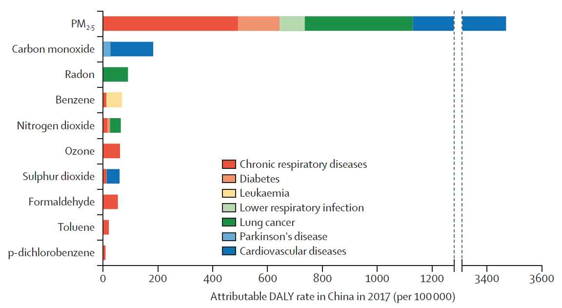 研究团队基于文献系统综述、荟萃分析和渗透系数法、时空高斯过程回归模型,获得了近20年中国内地全部省级行政区主要室内空气污染物浓度数据,以及我国室内空气污染物与心血管疾病、肺癌、白血病、哮喘等多种健康结局间的暴露反应关系,藉此采用人口归因分数,结合全球疾病负担数据,获得了我国室内空气污染暴露造成的疾病负担(DALYs即伤残调整生命年)和经济损失。