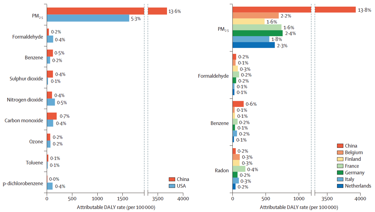 图2.中国及欧美国家室内空气污染物疾病负担对比
