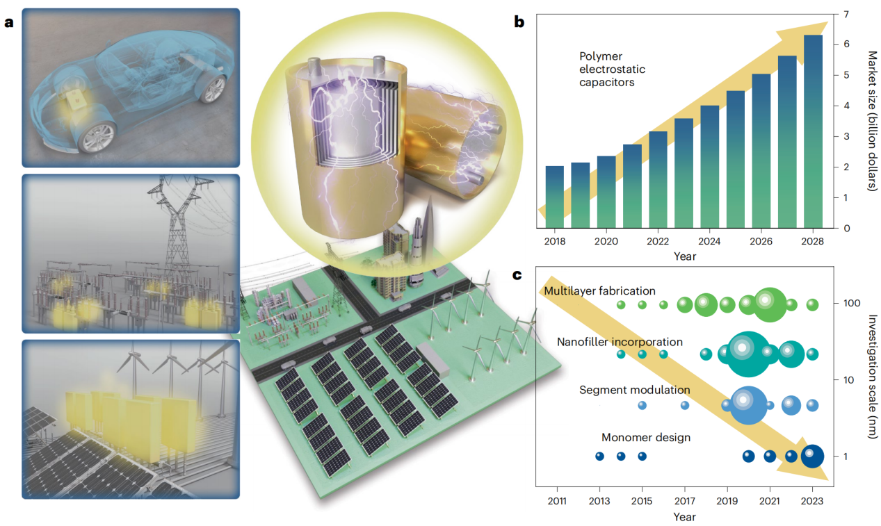 聚合物电介质是薄膜电容器的核心材料,具有功率密度高、充放电速率快、使用温度范围大、耐电压能力强等优势,在各类先进电子电力系统(如电磁能装备、新能源汽车、风/光发电设施)中发挥着不可替代的作用。然而,聚合物电介质的能量密度相较于锂电池、超级电容器等电化学储能器件较低,例如工业上常用的双轴拉伸聚丙烯的能量密度仅有5 J cm-3,且只能在105℃以下使用。为了实现器件的小型化和集成化,并保证其在严苛服役环境中的性能稳定性,聚合物电介质的高温能量密度亟待提升。