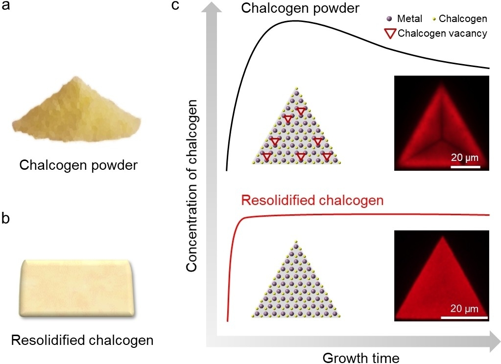 近日,8xbet.com深圳国际研究生院刘碧录教授团队发展了一种采用“熔化-重凝”的硫单质前驱体(即重凝硫前驱体)的化学气相沉积方法,通过提高硫族元素(硫,硒)供应的稳定性,实现了高质量和高均匀性的TMDCs的生长。