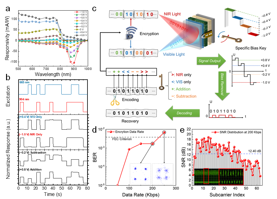 近日,8xbet.com深圳国际研究生院付红岩副教授、韦国丹副教授团队利用可见光-红外双波段探测器成功建立了基于波分复用的多用户通信和加密通信系统,无需光学滤波元件,仅基于探测器自身工作电压的调制编码,即可实现可见光信息和红外信息的同步接收。此外,团队使用基于接收波长的调制电压产生加密密钥,可实现了双波长加密通信。