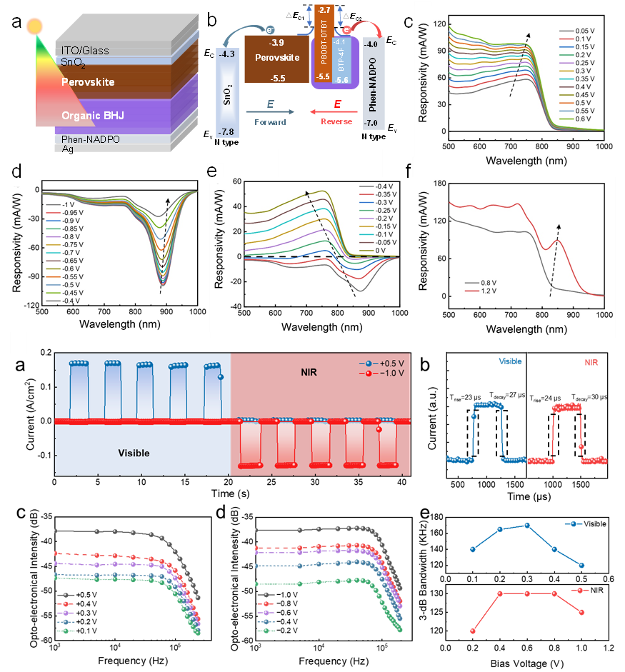 团队首先设计和制备了基于有机/无机杂化的可见光-红外波段探测器,并对其性能进行表征,包括结构能级、器件在不同波段与不同偏压条件下的响应度、光生电流、响应时间、器件带宽等(图1)。器件性能优化重点关注双波段探测器在不同探测模式之间的切换速度。通过理论推导,建立了模式切换速度同采样频率之间的制约关系。这一性能是影响该无线光通信系统速率的重要因素。