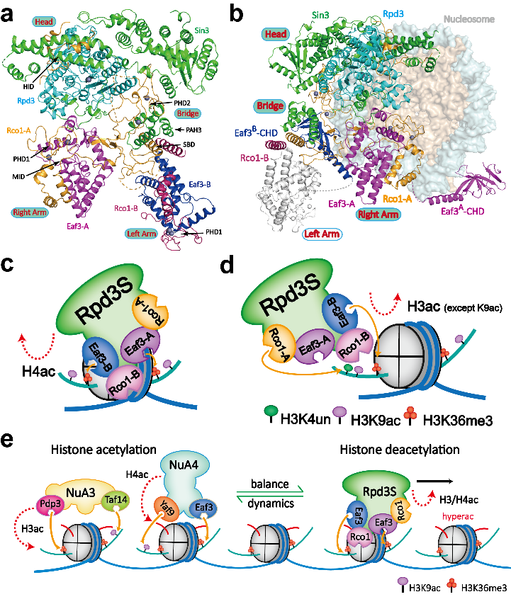 表观遗传是确保表型多样性的关键机制。组蛋白去乙酰化酶Rpd3是一类全局基因调控和共抑制因子,人源Rpd3S复合物的功能异常与肿瘤、心血管疾病发生相关,是重要的药物靶点。团队通过化学生物学手段构建人工修饰核小体,利用冷冻电镜技术解析了酵母Rpd3S与H3K36me3核小体的复合物结构,并结合酶活分析以及酵母遗传学等功能实验,系统全面的对Rpd3S复合物的组装模式、底物识别催化,以及修饰调控等过程进行了分子机制解剖,揭示出甲基化指引的染色质去乙酰化动态和多模态模型。论文成果以长文形式发表在《Nature》上。