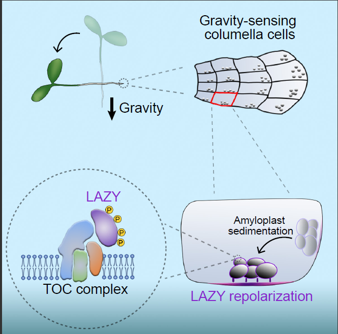 重力作用于地球上所有的生物,生物体如何感知重力是广受关注的科学问题。120年前提出的“淀粉-平衡石”假说认为植物特定细胞中淀粉体的沉降可起始重力感受,然而其作用机制长期未知。该成果揭示了淀粉体沉降过程中,其表面的TOC蛋白可携带并引导LAZY蛋白在细胞膜上形成新的极性分布,进而调控植物的向性生长。由此,该成果解析了重力这个物理信息转变为植物体内生理生化信号的关键机制,揭开了120年未解之谜。该成果发表于学术期刊《Cell》,被评价为“植物重力感应领域具有里程碑意义的工作”。