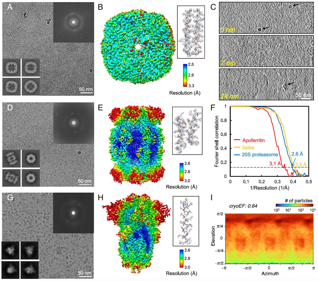 和常规单侧石墨烯膜支撑的冷冻样品相比(图1a),这种石墨烯“三明治”结构有助于补偿因电子束照射而损失的二次电子,减小冷冻样品在透射电镜下的电荷积累效应。并且,由于石墨烯优异的机械强度,该方法还可以有效防止冰层形变,降低电镜成像过程中的颗粒漂移,从而进一步提高冷冻电镜照片的质量。采用这种方法制备冷冻样品,研究团队成功获得了成像质量更高的冷冻电镜数据,解析了去铁铁蛋白、20S蛋白酶体和新冠病毒刺突蛋白的高分辨冷冻电镜结构(图2)。