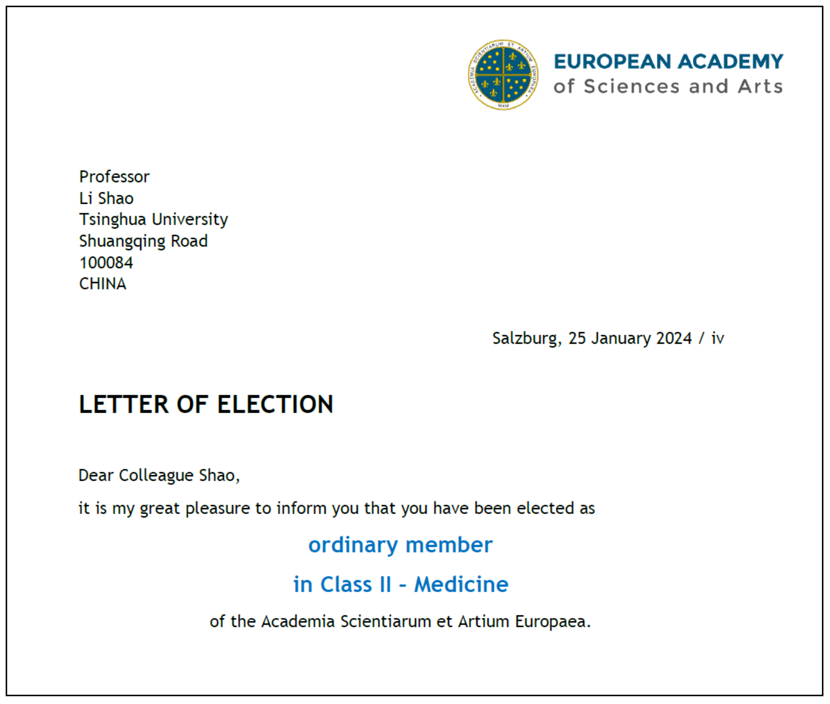 李梢当选为欧洲科学与艺术学院院士的贺信