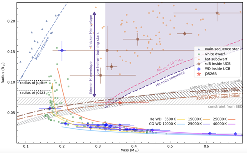 图2.不同类型恒星的质量-半径关系图。主序星、白矮星与热亚矮星分布在该图中三个可区分的区域。紫色区域代表热亚矮星可能分布的区域,而TMTS J0526双星系统的可见子星J0526B恰好落在该区域的最底端。该可见子星比过去发现的最小尺寸恒星(2MASS-J0523)还要小,代表了迄今发现的最小尺度的非简并星。