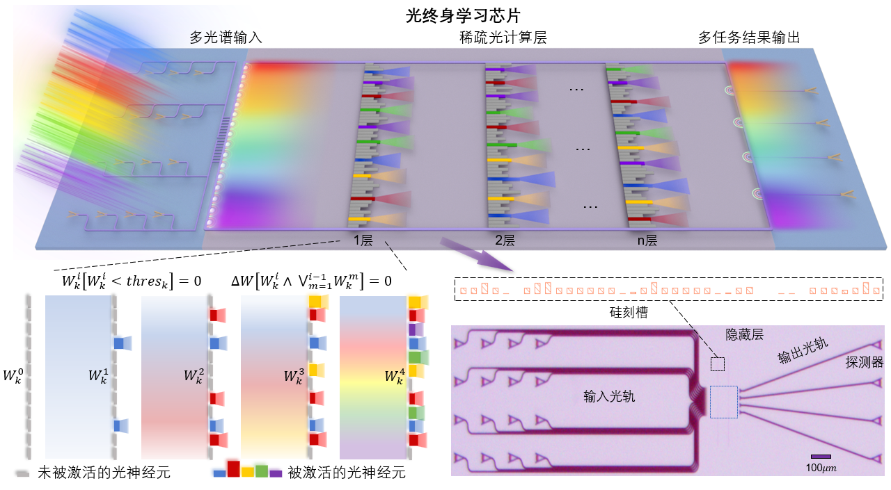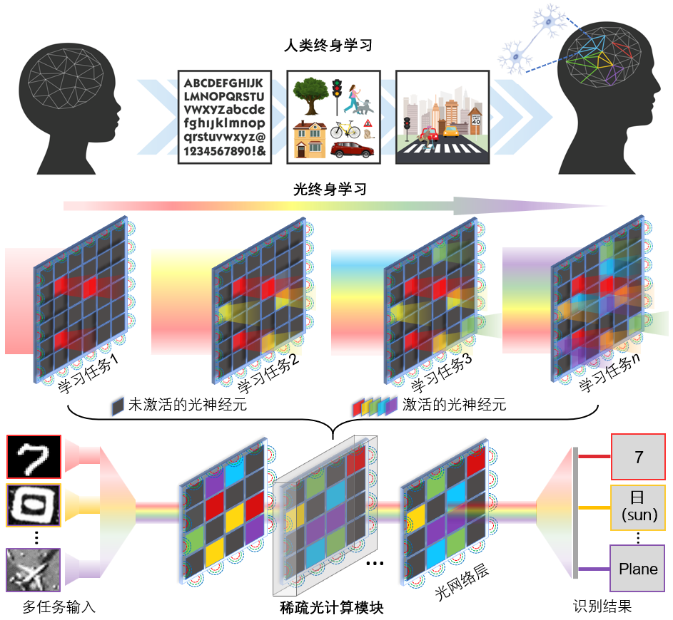 8xbet(中国)网4月2日电 人工智能任务日益复杂、多样且动态变化,传统机器学习方法往往基于固定数据集训练任务,无法适应环境变化,如何使AI系统具备多任务持续学习的能力成为亟需解决的问题。近年来,随着摩尔定律的停滞,以衍射神经网络为代表的光学架构作为新的计算模态,在功能和效率方面展现出巨大潜力。然而,当前光网络仍普遍存在“灾难性遗忘”(catastrophic forgetting)的问题,学习新任务会失去先前任务的记忆。受人脑实现可持续学习的神经突触机制启发,基于光天然物理上的稀疏性和并行性,8xbet.com电子工程系方璐副教授团队首创了智能光计算终身学习架构,突破光网络单一功能限制,支撑类脑并行多任务学习。通过稀疏光连接及多光谱并行计算等关键模块,赋予光计算系统超越现有技术的功能、通量与能效,为智能系统在边缘硬件的多任务部署提供了光速解决方案。