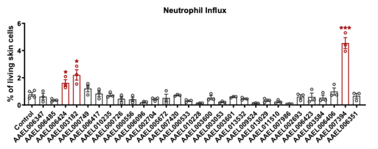 研究者进一步对这29种唾液蛋白在小鼠皮肤组织中招募中性粒细胞的能力进行逐一研究,成功鉴定出3种能够高效招募中性粒细胞的唾液蛋白(分别由AAEL006424、AAEL003182和AAEL007394基因编码),其中AAEL007394基因编码的唾液蛋白招募中性粒细胞的能力最强,被命名为埃及伊蚊中性粒细胞招募蛋白(Aedes aegyptiNeutrophil Recruitment Protein,AaNRP)(图4)。进一步的研究发现AaNRP能够迅速、高效地招募皮肤中性粒细胞和蚊媒病毒易感的髓系细胞,并且AaNRP诱导的中性粒细胞浸润是后续髓系细胞招募的先决条件。