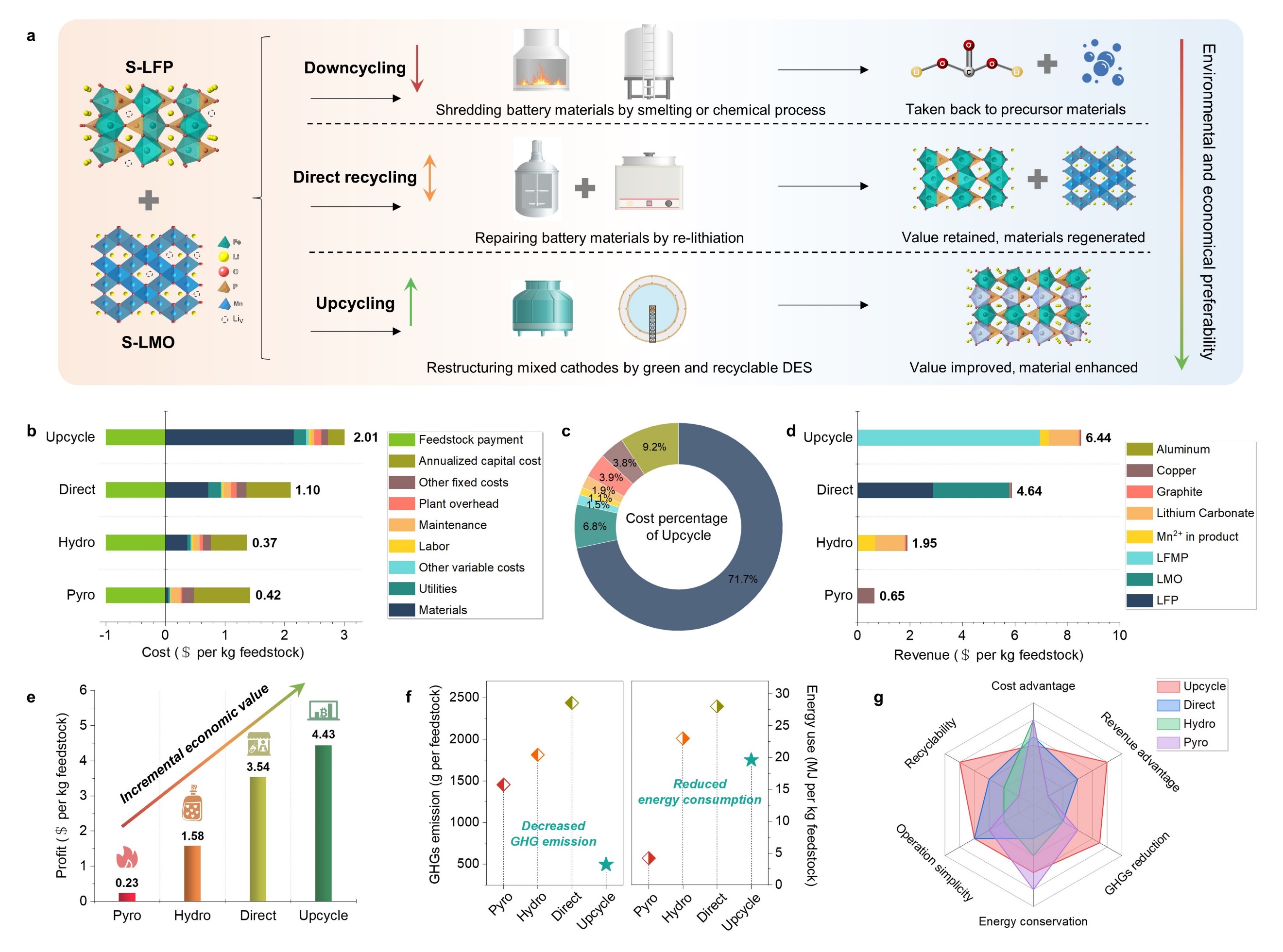 8xbet.com深圳国际研究生院周光敏副教授,中国科学院深圳先进院与金属研究所、深圳理工大学(筹)成会明院士,上海交通大学梁正副教授团队提出了一种针对混合失效正极材料(LFP+LMO)的升级回收策略,以绿色环保的低共熔溶剂为介质,通过结构调控和过渡金属替换,将其转变为更高能量密度的聚阴离子型正极材料。再生磷酸锰铁锂正极材料的中值电压和能量密度分别提升至3.68V(相对于Li/Li+)和559 Wh/kg,均高于商业LFP(3.38 V和524Wh/kg)。该策略可以实现混合正极中的全元素回收和溶剂的循环利用,同时可扩展合成其他高电压磷酸盐材料。经济性分析表明,升级回收策略具有更高的经济和环境效益,为回收低价值的混合正极材料升级为下一代正极材料提供了一种新思路。