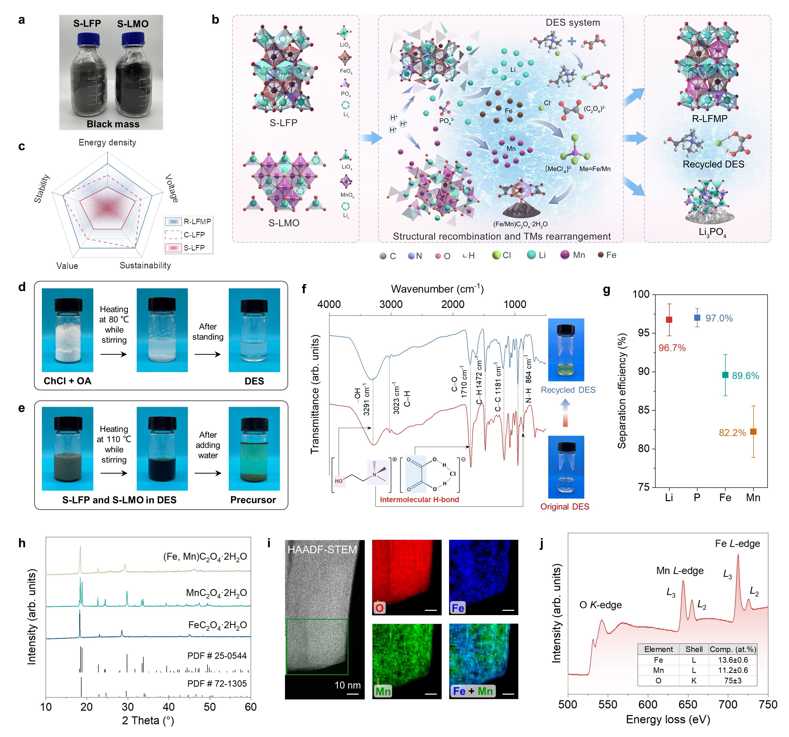8xbet(中国)网5月23日电 近年来,锂离子电池(LIB)的可持续回收逐渐成为业内关注焦点。在电池的所有组分中,正极材料占据最大重量并主导了电池成本,其回收再利用刻不容缓。商业正极材料包括橄榄石型磷酸铁锂(LFP)、层状钴酸锂/三元材料以及尖晶石锰酸锂(LMO)。因为这些正极具有不同的晶体结构,目前的直接回收方法主要针对单一特定成分,同时处理多种正极材料仍面临很大挑战。传统火法或湿法回收通过高温熔炼或化学过程破坏电池材料,并需要复杂的步骤来分离不同的元素,导致二次污染。更重要的是,失效LFP或LMO电池中的有价元素含量低,而这些方法产生的Fe/Mn产物具有较低经济价值,因此需要发展更好的回收技术来实现混合正极材料的经济回收。
