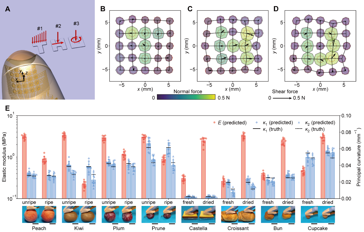 课题组基于这种具有三维架构的电子皮肤,结合深度机器学习算法,研制出只需通过触摸便可同时测量物体模量及局部主曲率的先进触觉系统(图2),展示了其在判别食物新鲜程度等真实场景中的应用,并深入探讨了其在物理量定量测量(如摩擦系数等)、人机交互等重要领域的应用潜力。