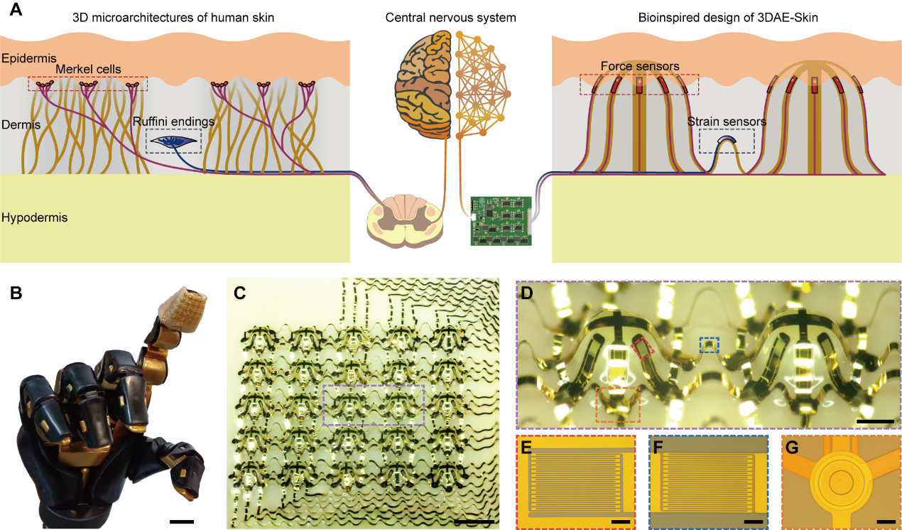 8xbet(中国)网5月31日电 复刻人类皮肤源于自然演化的高级感知功能,是电子皮肤、机器人等前沿科学技术领域长期追求的目标。为此,科学家们开展了大量研究工作,并取得了丰硕的成果。然而目前,尚未有电子皮肤能够复现人体皮肤中机械感受器的细微观三维空间分布形式,进而像皮肤一样,在物理层面实现压力、剪切力、应变等多种机械信号的同步解耦感知。