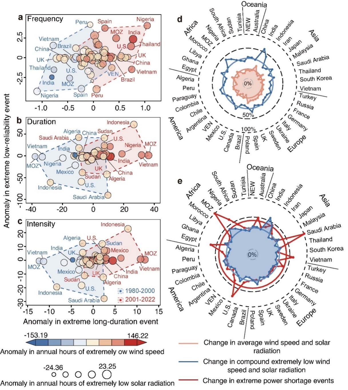 研究进一步将极低风速和极低太阳辐射(低于日均值第10百分位数)同时出现的时段定义为极低风速-极低太阳辐射复合事件,以探讨极端电力短缺事件年际变化的气候驱动因素。研究发现,极低风速和极低太阳辐射的增加可能推动了极端电力短缺事件的增长。1980年以来,极低风速-极低太阳辐射复合事件持续增加,并与极端电力短缺事件呈正相关。然而,极端电力短缺事件变化与气候要素变化并不成比例。与1980-2000年相比,2001-2022年全球1%的平均风速和太阳辐射变化带来了超过10%极低风速-极低太阳辐射复合事件变化,并进一步引发了约30%的极端电力短缺事件变化(图2)。因此,即使在未来温和气候变化情景下,高比例风光系统极端电力短缺事件也可能大幅增加。