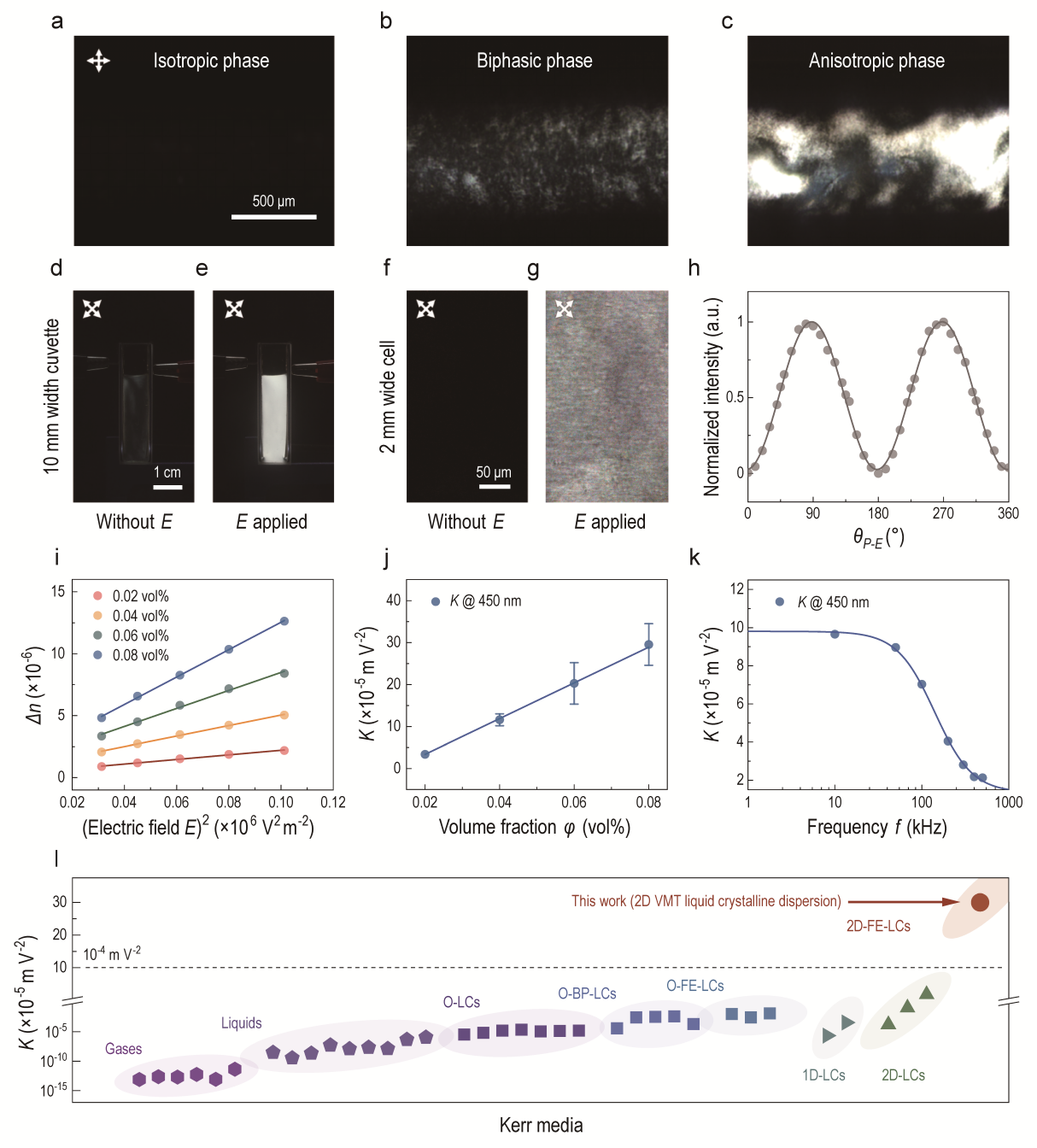 研究人员首先发现,二维蛭石的水分散液是一种溶致液晶体系。二维蛭石液晶在1.0×103V m-1的横向电场下即展现出明显的电光响应,工作电场强度低于传统液晶2~3个数量级(~106V m-1)。定量数据揭示,体积分数仅为0.08vol%的二维蛭石分散液具有3.0×10-4m V-2的克尔系数,高于目前所有已知克尔介质(包括各类有机液晶、无机纳米液晶等)至少一个数量级。实验和理论共同说明,该巨电光克尔效应可能来源于二维蛭石的固有电偶极矩,指示二维蛭石可能存在本征铁电性。