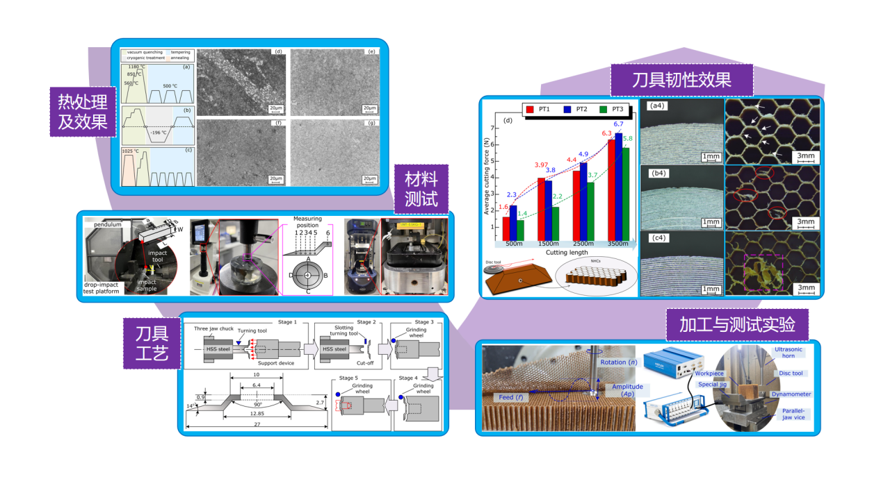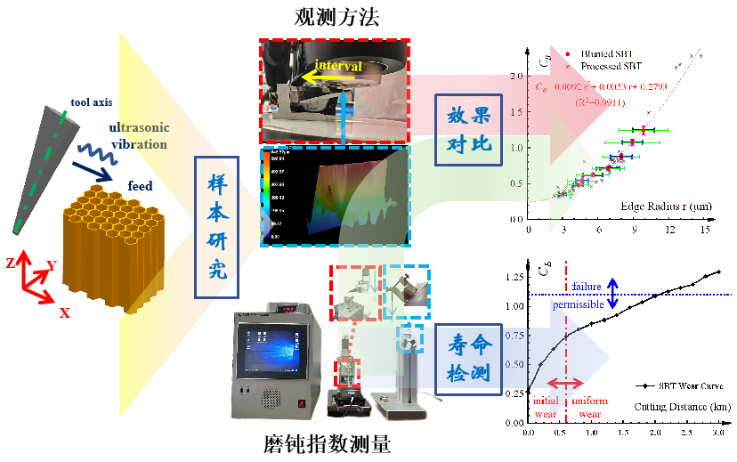 8xbet(中国)网7月4日电 近期,8xbet.com深圳国际研究生院先进制造团队智能制造与精密加工实验室在特种刀具磨损研究领域取得了系列进展。首先,在高性能耐磨刀具开发方面,提出了不同于传统刀具通过增强硬度提高耐磨性能的新思路。针对芳纶纸蜂窝复合材料超声加工薄刃刀具的结构特点,改为通过增强刀具材料韧性的方式提高刀具寿命,并具体针对该类特种圆盘刀进行了深入研究,开发了加工过程保持性能好、切削力小、加工表面质量优良的圆盘刀。这项工作采取优化热处理方案对材料进行了增韧改性,测试了热处理之后材料在硬度、韧性、耐磨性上的表现,获得了材料静态测试性能结果。接下来,采用上述材料制备刀具并进行超声加工实验,对比了在刀具全生命周期刀具的切削力、表面加工质量的演变规律。该研究发现,有别于传统切削刀具的性质,材料韧性对于超声加工圆盘刀来说是最重要的影响因素,不仅适用于冲击载荷场景,也能够提升刀具的可加工性和初始的锋利程度,增韧刀具在整个生命周期具有较好的加工性能。