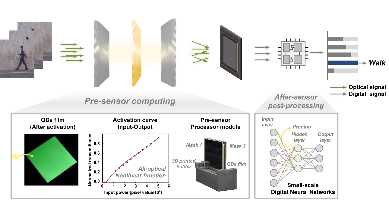 8xbet(中国)网7月30日电 在物联网时代,视觉图像传感器作为智能社会的关键设备,被嵌入到诸如移动通信终端、智能穿戴设备、汽车和工业机器等各种设备中。随着应用的不断扩展,对传感器的系统功耗、响应速度、安全性能等方面也提出了更高的要求。而在传统的“感传算”链路中,内存的访问速度和通信带宽逐渐成为了限制系统功耗及速度的主要瓶颈。将计算单元向传感单元靠近,使系统的近传感端拥有一定的数据处理能力,逐渐成为解决这一问题的有力途径。感前光计算相比于其他近感计算方式,具有高速、高带宽、低功耗的优势。然而,目前绝大部分光神经网络需要相干激光作为光源,硬件系统笨重复杂,且仅能完成线性运算,缺乏层间非线性激活,限制了感前光计算在边缘场景的应用。