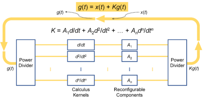 图1.可重构超材料处理器的基本架构。包含反馈回路、微积分内核、具有调幅调相功能的可重构元件等基本单元