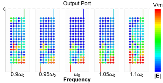 图2.基于逆向设计像素超材料的一阶微分内核,以及其在不同频率下的表面电场分布
