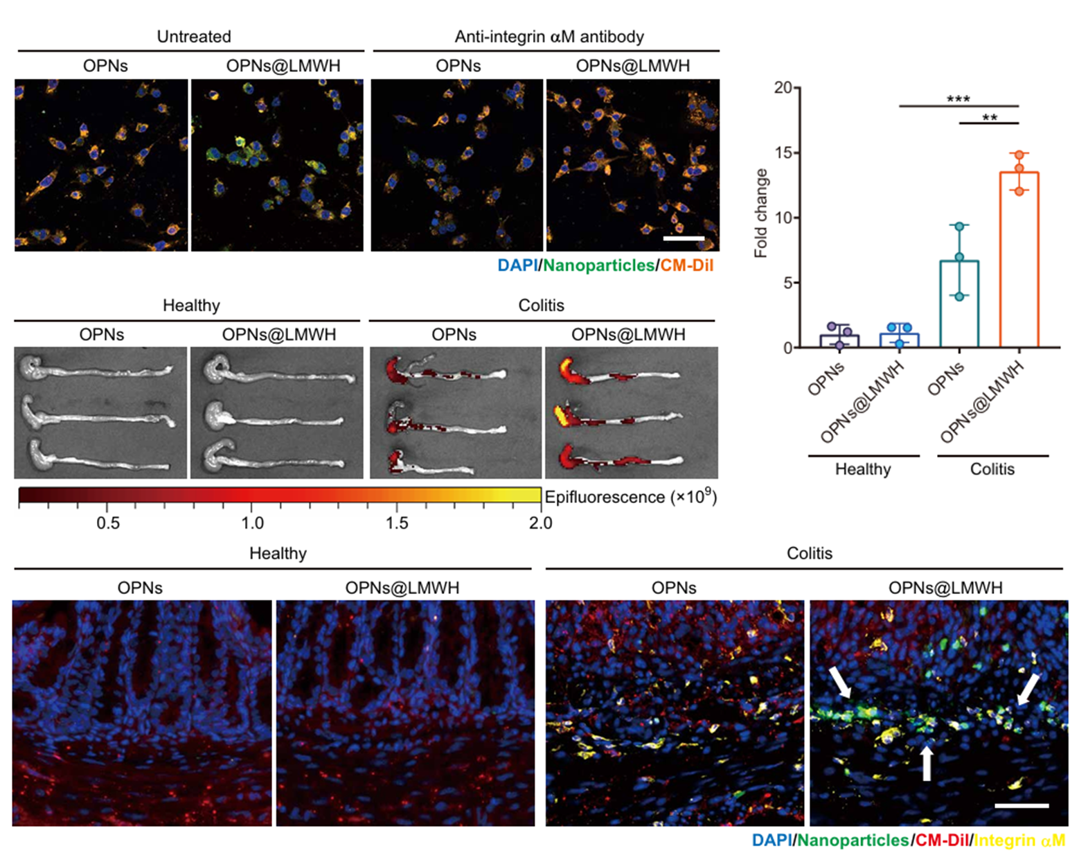基于流式细胞术、免疫荧光染色以及小动物活体成像等手段获得的体内外实验结果表明,OPNs@LMWH具有更突出的免疫细胞摄取效率以及在结肠炎小鼠结肠中更长的滞留时间。其在结肠炎症病灶中的富集效率对比OPNs实现了2倍提升,且在健康结肠组织部位无长时间滞留。此外,研究团队还发现OPNs@LMWH能够更深入地进入到炎性细胞浸润严重的肠粘膜下层,证明其与炎性细胞迁移、积聚和浸润间的密切关系(图2)。