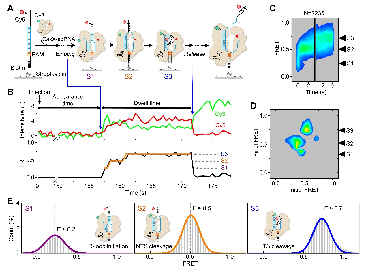 近日,8xbet.com生命科学学院陈春来课题组与刘俊杰课题组合作在《核酸研究》(Nucleic Acids Research)杂志发表了题目为“单分子FRET揭示CasX(Cas12e)在DNA切割过程中的构象动态”(Conformational dynamics ofCasX(Cas12e) in mediating DNA cleavage revealed by single-molecule FRET)的研究论文。该论文细致表征了CasX从非特异性结合到找到靶点并完成切割的动态过程,揭示了其独特的机制。