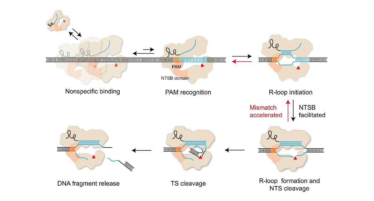 最后,研究人员构建了CasX识别与切割DNA的动态模型(图2)。CasX在搜寻靶点时与DNA短暂非特异性结合(Nonspecific binding),在动态搜索过程中识别PAM序列(PAM recognition),开始形成R-loop结构(R-loop initiation),然而,相较于SpCas9、AsCas12a和LbCas12a,CasX在这一步的效率低5至8倍。识别PAM后,CasX依赖充足的PAM近端匹配驱动R-loop形成,并利用单一的RuvC结构域活性中心依次切割NTS和TS(R-loop formation and NTS cleavage,TS cleavage),最后释放切割产物(DNA fragment release)。CasX独特的NTSB结构域在DNA解旋和R-loop形成中发挥了重要功能。这一动态模型深化了我们对CasX工作机制的理解,并为CasX以及其他Cas蛋白的优化和改造提出了新的思路和策略。