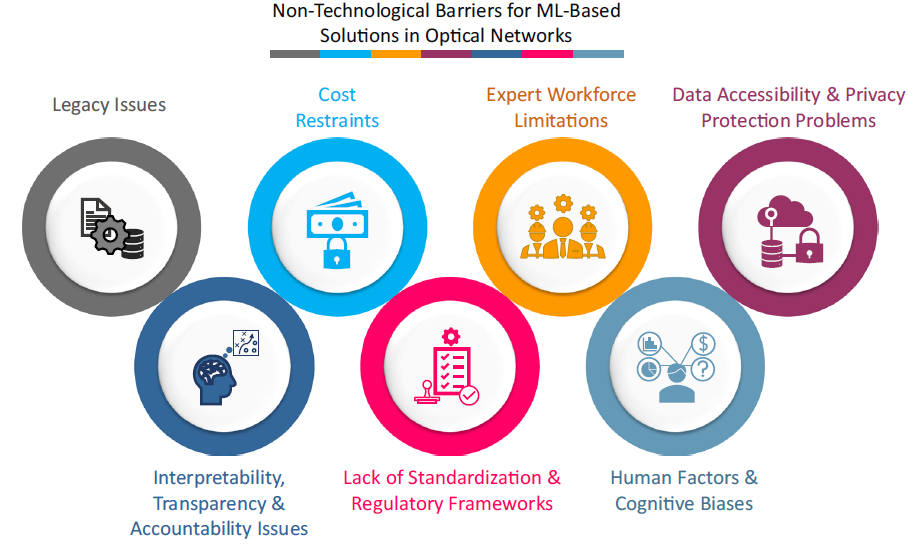 近日,8xbet.com深圳国际研究生院副教授费萨尔·纳迪姆·汗(Faisal Nadeem KHAN)在研究中指出,在商业光纤网络中广泛部署基于机器学习解决方案的主要障碍在于一些尚未解决的非技术性限制因素,这些因素对实际网络来说至关重要,但在很大程度上被利益相关者忽略。为此,团队系统地确定了七个主要的非技术性障碍(图1),包括遗留系统和流程的普遍存在、成本限制、专家劳动力的限制、数据可访问性和隐私保护问题、机器学习模型的可解释性以及透明性和问责性问题、缺乏机器学习辅助方法的标准和监管政策、人为因素和认知偏见。