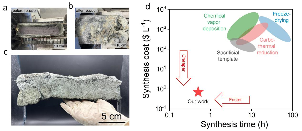 图1.自蔓延合成碳化硅气凝胶产品实物图与工艺分析