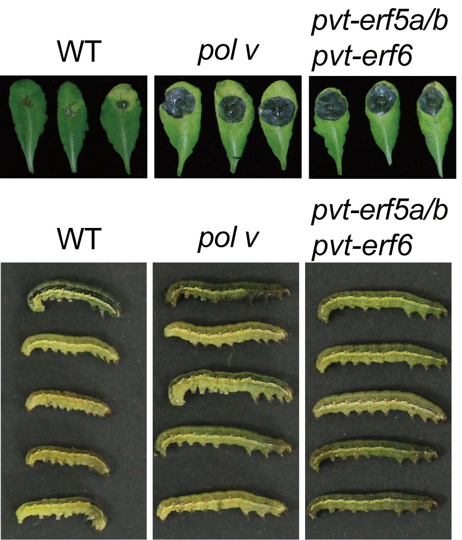 研究进一步探索了Pol V如何调控基因表达。通过系统分析,鉴定了13000多个Pol V转录本(PVT),并发现近一半受Pol V调控的基因附近存在PVT。为了验证PVT是否可以直接调控邻近基因表达,该研究选取了JA响应基因ERF5和ERF6上游区域产生的PVT——PVT-ERF5a/b和PVT-ERF6进行深入研究。通过CRISPR/Cas9技术敲除或利用人工miRNA敲减PVT-ERF5a/b和PVT-ERF6,证明这些PVT为ERF5和ERF6高效表达及植物对灰霉和甜菜夜蛾的抗性所必需。这些结果表明,Pol V可通过其转录产物正向调控ERF5和ERF6表达,从而增强植物对病虫的抗性。