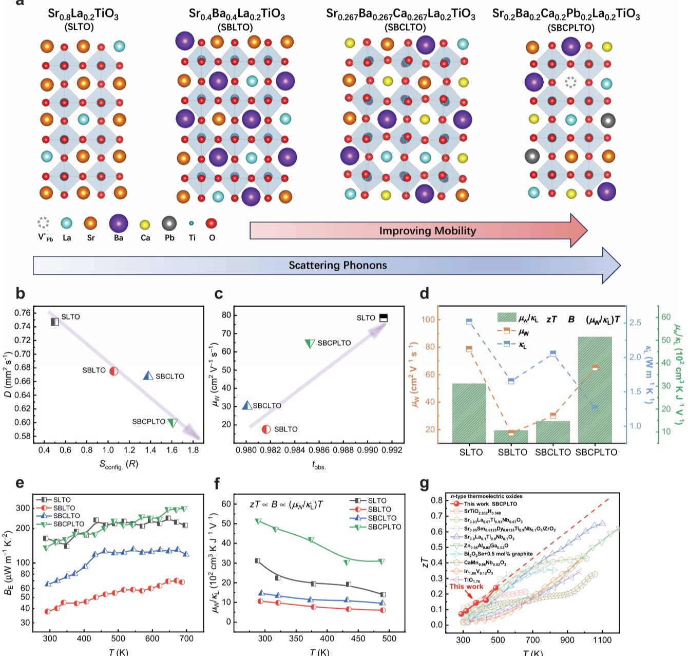 总结来看,由于钛酸锶基钙钛矿(ABO3)中A位主要影响声子声学支和低频光学支,因此A位固溶多种元素对于热传输有着显著散射,结合熵引入的位错和应变,样品的热扩散系数D随着熵Sconfig.增大而降低;另一方面,钛酸锶基体系的电学性能由TiO6八面体决定,因此,不对Ti位进行元素固溶,并通过调控A位元素平均尺寸从而影响钙钛矿结构容忍因子的方式,可以调控材料的Ti位移和电输运性能。容忍因子越接近1,样品的迁移率越高。总而言之,通过熵工程设计时的分位置调控和元素合理选择,本工作在钛酸锶基体系中成功实现了电热输运解耦和高的热电性能(图4)。