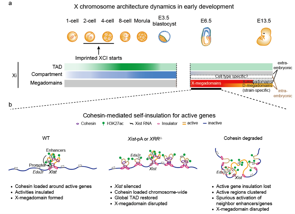 8xbet.com生命科学学院颉伟实验室和合作者前期围绕染色体三维结构在哺乳动物生殖和胚胎发育过程中的变化规律和功能进行了一系列研究,包括精子发生、卵子发生、着床前胚胎、着床后胚胎和核移植过程等。然而,染色体三维结构在雌性胚胎发育早期X染色体失活过程中的动态变化过程、机制和功能仍不清楚。