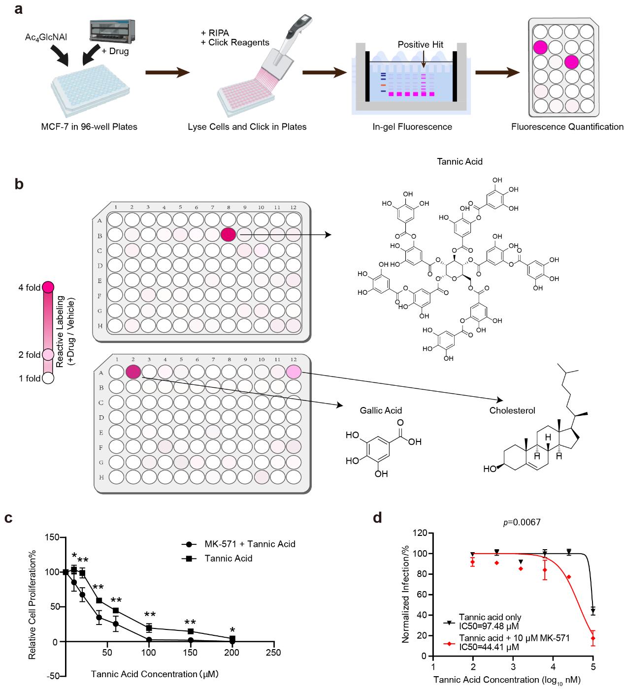 研究人员进一步基于BRIEF建立小分子药物的外排筛选平台,对409种天然产物的外排情况进行了筛选鉴定(图3a),从而发现了单宁酸、没食子酸和胆固醇这三种天然小分子可以由ABCC外排泵所排出(图3b)。其中单宁酸对Ac4GlcNAl标记信号的提高最为明显,研究人员进一步验证了ABCC的抑制剂是否可以增强单宁酸的药用活性。单宁酸已知具有抑制癌细胞增殖和抗SARS-COV-2的活性,研究人员发现结合ABCC抑制剂MK-571处理,可以显著提高单宁酸的抑癌活性(图3c)和抗SARS-COV-2的活性(图3d)。