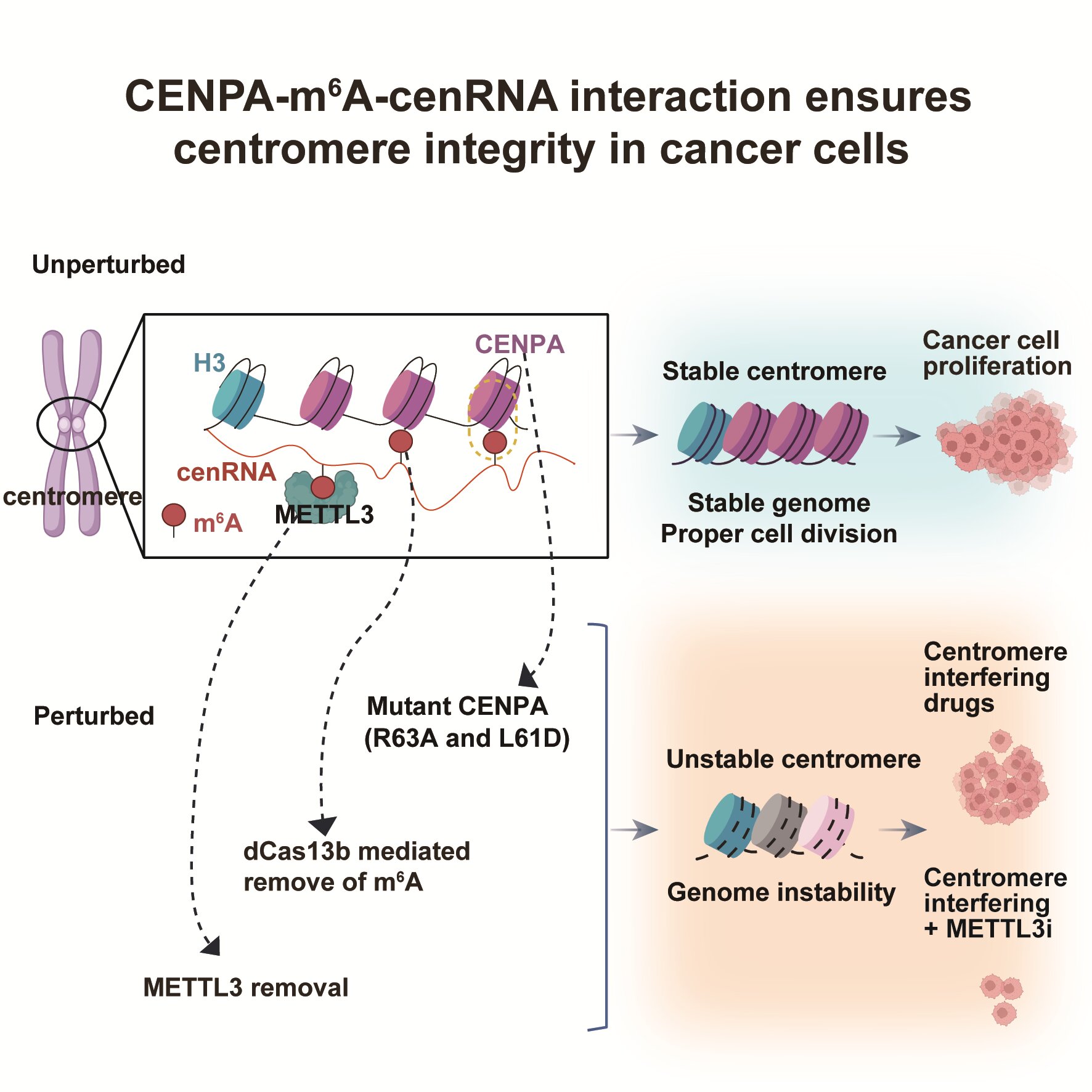 RNA m6A修饰(N6-甲基腺嘌呤)已被广泛报道几乎参与mRNA生命周期的所有阶段,与一系列复杂疾病的发生发展相关。近年来,越来越多的证据表明m6A修饰也存在于非编码RNA,特别是染色质结合的一些RNA(chromatin-associated RNAs,caRNAs)上,并介导新的功能,例如调控染色质状态和基因转录等。此前研究也发现着丝粒区域可以转录出着丝粒重复序列RNA(centromeric RNA,cenRNA),这些cenRNA似乎参与调控着丝粒稳态和细胞周期进程,但其关键机制仍不明确。
