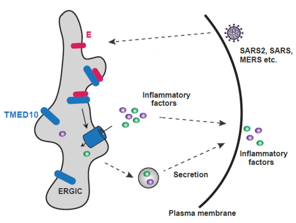 研究人员首先检测了一系列新冠病毒的膜蛋白对炎症因子分泌的影响,发现E蛋白强烈刺激宿主细胞炎症因子的释放,且相比于轻症冠状病毒,重症冠状病毒的E蛋白刺激炎症因子释放的程度明显更高,提示E蛋白是重症冠状病毒感染导致炎症风暴和重症的一个通用致病因子。随后,研究人员通过对分子机制的深入研究,发现重症E蛋白通过与TMED10蛋白强烈互作激活THU非经典分泌通路从而加剧炎症因子的释放(见图)。最后,研究人员筛选鉴定到一类孕酮类小分子药物,能够抑制E-TMED10相互作用,从而减弱炎症因子的分泌,减轻机体的炎症反应。这些发现阐明了重症冠状病毒诱导机体高炎症的分子机理,提出了E-TMED10相互作用可作为对抗冠状病毒诱导的炎症不良反应的潜在治疗靶点,为应对未来可能新发的冠状病毒疫情提供了思路。