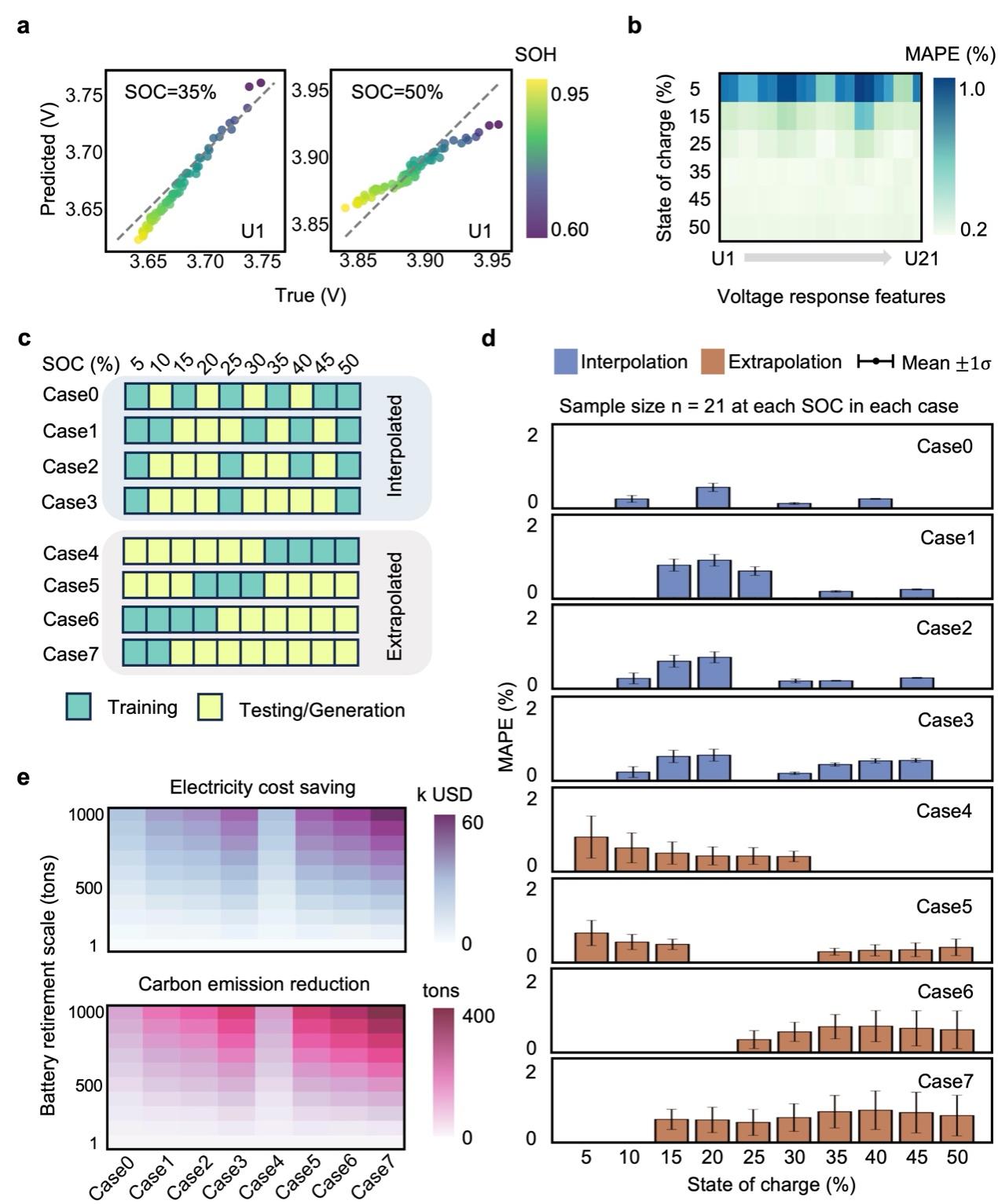 团队通过生成式机器学习方法,在少量已测量数据的基础上,实现了未测量数据空间的精准探索。模型利用已有的脉冲电压响应数据进行训练,可生成不同SOC条件下的新脉冲电压响应数据(图3)。实验表明,无论在内插还是外推场景中,生成数据的平均绝对百分比误差(MAPE)均低于2%,充分证明了模型对已测量数据分布的有效学习能力及其生成多样化数据样本的潜力。