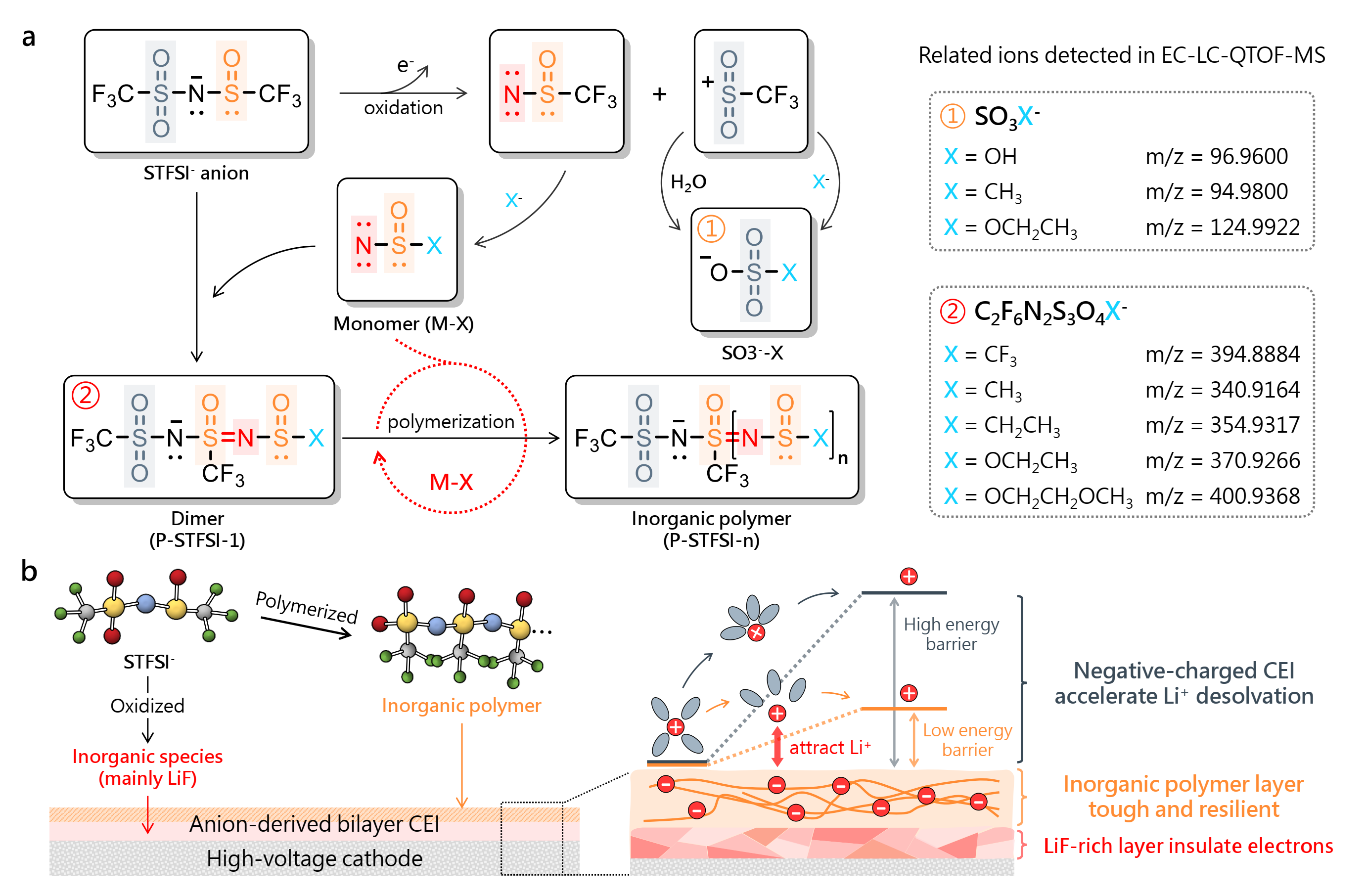 不对称锂盐LiSTFSI可以在高压正极表面触发特殊的阴离子电化学氧化耦合聚合机理,构筑一个由N-S为主链的阴离子无机聚合物覆盖的双层CEI。界面中特殊的无机阴离子聚合物能够同时表现出无机物的硬度和聚合物的韧性,赋予界面优异的机械稳定性。同时,无机阴离子聚合物能够在CEI中附加固定的负电荷,其与锂离子间的库伦作用能够吸引锂离子进而加速正极表面的去溶剂化过程,显著降低界面的电荷转移阻抗和能垒。这一加速的界面动力学能够显著提高锂金属电池在极端条件(低温、高功率)下的电化学性能。