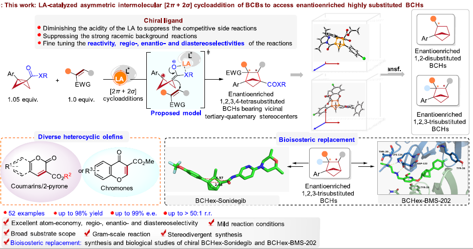 相关研究成果以“路易斯酸催化双环[1.1.0]丁烷的不对称[2π+2σ]环加成反应:高效合成多取代双环[2.1.1]己烷作为手性生物电子等排体”(Catalytic Intermolecular Asymmetric [2π + 2σ] Cycloadditions of Bicyclo[1.1.0]butanes: Practical Synthesis of Enantioenriched Highly Substituted Bicyclo[2.1.1]hexanes)为题,于12月3日发表于《美国化学会志》(Journal of the American Chemical Society)。