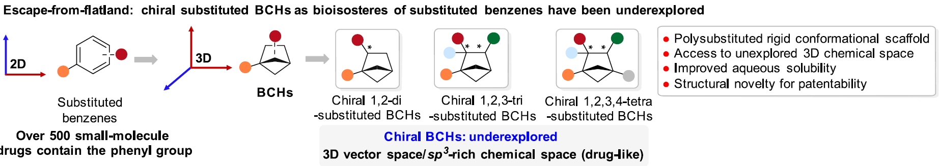 8xbet(中国)网12月13日电 在药物化学研究中,根据“逃离平面”概念,提高sp³杂化碳的比例和手性碳的数目可以增加候选药物分子的复杂性,从而提高其临床成功率;因此三维(3D)、饱和的、桥环类化合物在药物化学中受到广泛关注,其中BCHs能够作为多种不同取代苯基的生物电子等排体;然而,目前手性BCHs的合成方法尚未得到充分研究,且手性BCHs替代生物活性分子(或小分子药物)中的苯环及其生物活性研究还未见文献报道(图1)。