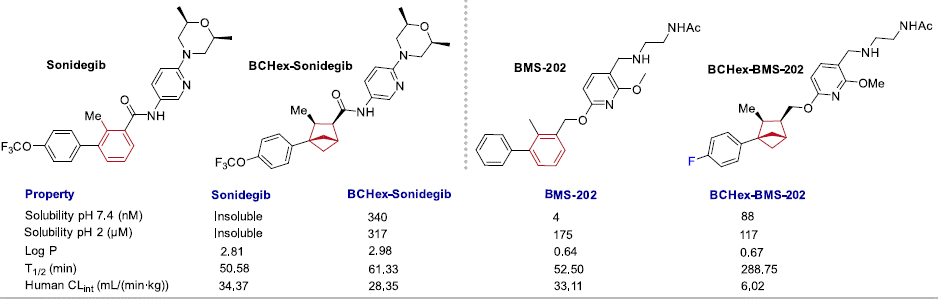 研究团队接着评估了BCHex-Sonidegib和BCHex-BMS-202的理化性质和药理学特性(图3),结果显示,与阳性对照Sonidegib和BMS-202相比,BCHex-Sonidegib和BCHex-BMS-202表现出更好的溶解性和代谢稳定性;同时,它们表现出与阳性对照Sonidegib和BMS-202相当的抗肿瘤活性(MTT)(表1),在正常的肝脏细胞中表现出更低的毒性,且能诱导肿瘤细胞凋亡和抑制肿瘤细胞的克隆形成(图4)。这项研究工作是国际上首次利用手性1,2,3-三取代的BCHs替代1,2,3-三取代的苯环,突显了手性多取代BCHs作为苯环生物电子等排体在药物化学中的潜在应用。