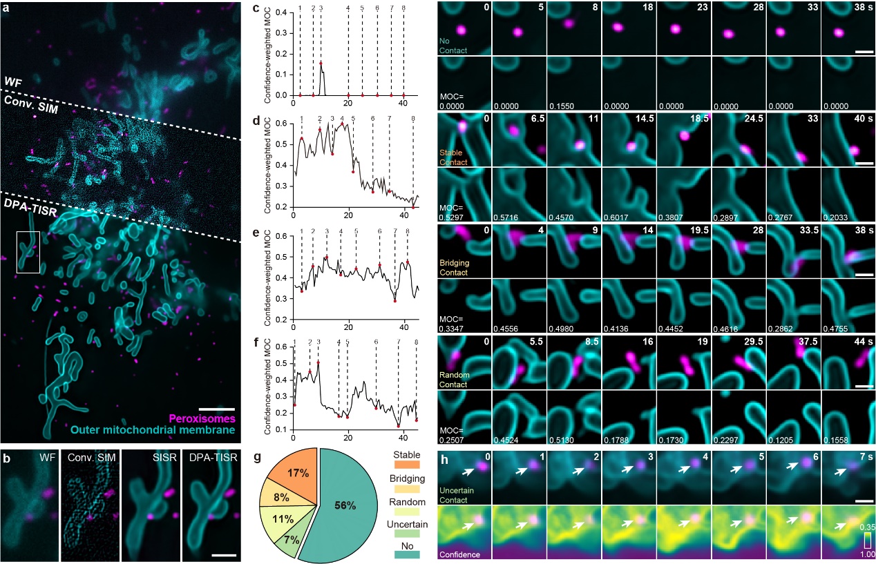 Bayesian DPA-TISR准确的置信度量化能力可以助力更加严谨的生命科学研究。例如,过氧化物酶体(PO)是一种频繁与线粒体接触以调节细胞活性氧代谢的功能性细胞器,然而受限于观测手段,线粒体-过氧化物酶体相互作用的类型和比例至今未被系统研究。借助DPA-TISR的高速、长时程、超分辨成像能力,研究团队能够清晰地分辨出两种细胞器空间关系与互作机制(图3),进而发现几乎一半PO从未与线粒体发生接触,同时另一半曾与线粒体互作的PO可以分为三类:17%的PO与单个线粒体的接触位点稳定关联;8%的PO同时连接两个或更多的线粒体,充当桥梁的作用;11%的PO随机地改变其与线粒体的接触位点,充当细胞内信使的角色。特别地,最后7%的PO类型被划分为不确定,因为Bayesian DPA-TISR警示图像在该区域的置信度过低,无法进行可信的行为分类(图3h)。这一研究表明,Bayesian DPA-TISR可以为超长时程活细胞超分辨成像以及置信度可量化的生物分析提供全新的技术路径和广泛的应用基础。