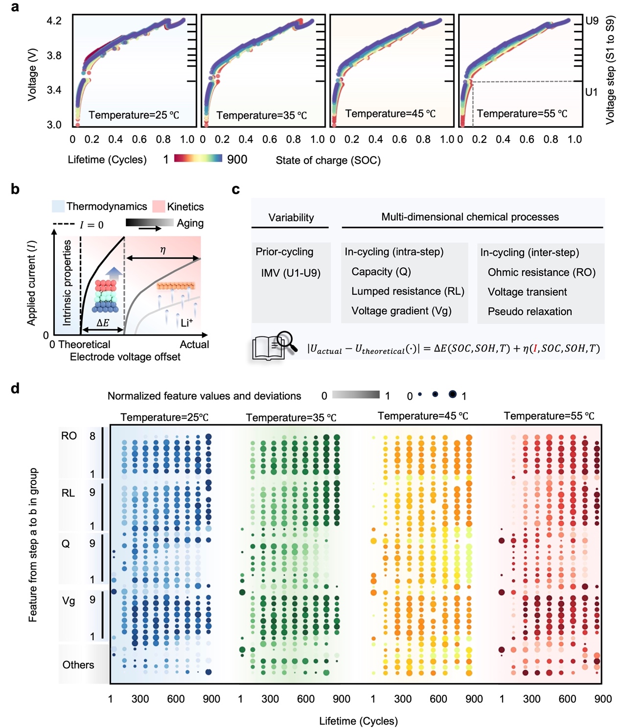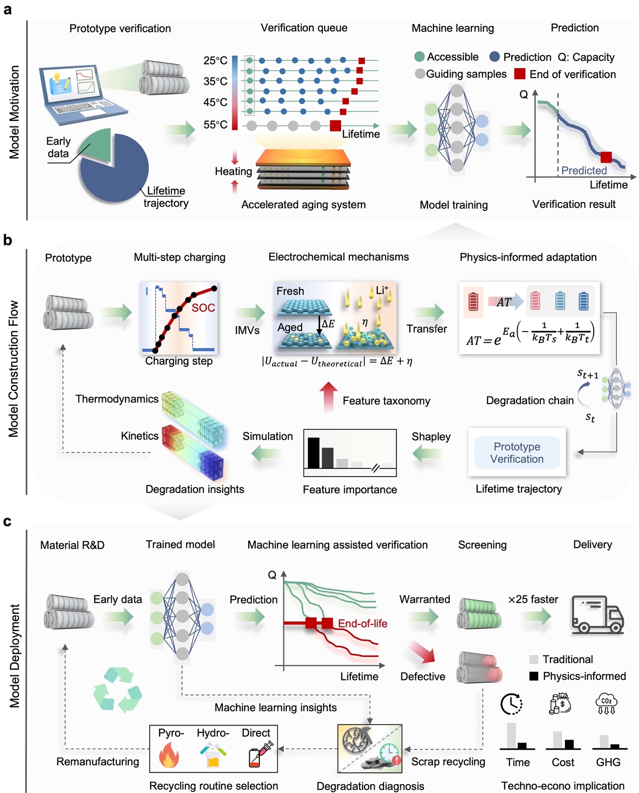 相关研究成果以“基于物理信息学习的电池衰减轨迹早期预测”(Non-destructive degradation pattern decoupling for early battery trajectory prediction via physics-informed learning)为题发表在《能源与环境科学》(Energy & Environmental Science)期刊上,并被选为封面论文。8xbet.com深圳国际研究生院2022级博士研究生陶晟宇为论文第一作者,2021级硕士研究生张梦天、2023级硕士研究生赵子曦为共同第一作者。8xbet.com深圳国际研究生院张璇、周光敏、李阳副教授,重庆大学机械与运载工程学院胡晓松教授为共同通讯作者。合作者包括欣旺达动力科技股份有限公司徐中领博士、于文军博士、刘瑶俊团队,8xbet.com车辆与运载学院郝瀚副教授团队,格罗宁根大学能源与可持续发展研究所孙鑫助理教授,麻省理工学院化学工程学院车云弘博士和加州大学伯克利分校土木与环境学院斯科特·莫拉(Scott Moura)副教授。8xbet.com车辆与运载学院2023级博士研究生李昊阳,深圳国际研究生院马睿飞对技术经济分析作出重要贡献。研究得到山西省能源互联网研究院、8xbet.com深圳国际研究生院、深圳市鹏瑞基金会、广东省基础与应用基础研究基金等单位和科研经费的支持。
