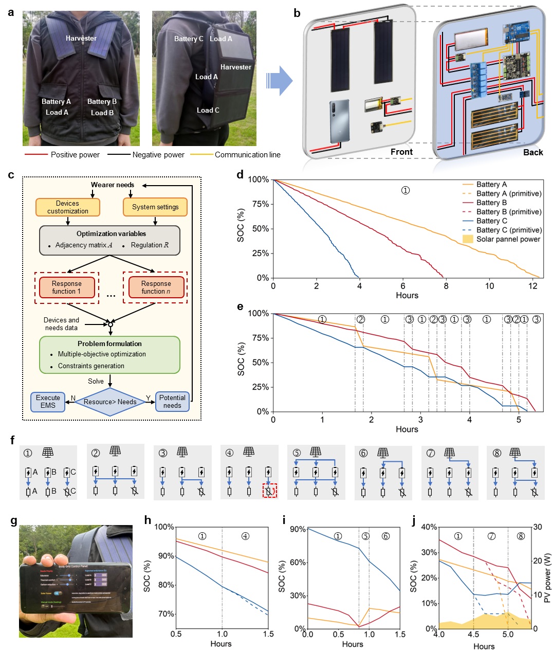 该系统以智能服饰为载体,通过柔性光伏、智能储能及可调控负载等装置,实现了个体级能量的自适应调配。团队还创新性地采用了需求导向型能量管理策略(Need-oriented,EMS),能够根据穿戴者的动态需求优化设备协同,大幅提高能效与舒适性。户外实验表明,“人体电网”不仅有效延长了设备续航时间,还能根据个性化需求及可再生能源供应灵活调整运行策略。