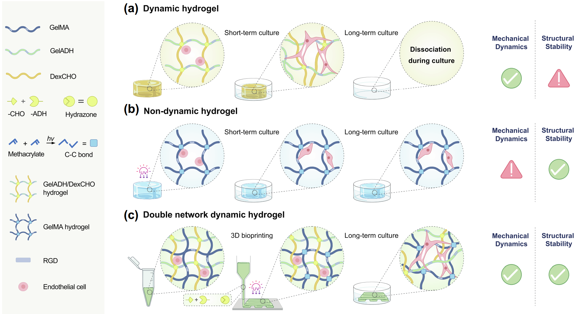 8xbet(中国)网3月5日电 生物组织的生长是一个动态过程,在工程化组织/器官构建中,如何构建适配的三维动态微环境是一个关键问题。已有研究表明,负载细胞的水凝胶的基质动态性有助于血管形态发生,对于构筑活性组织的“生命线”具有重要意义。然而,常见的动态水凝胶基质受限于可逆交联解离或细胞介导的降解,通常在体外培养过程中存在力学不稳定性,几天以后即出现结构坍塌降解,难以支持长期培养,阻碍了其在组织器官构建和生物制造方面的应用。