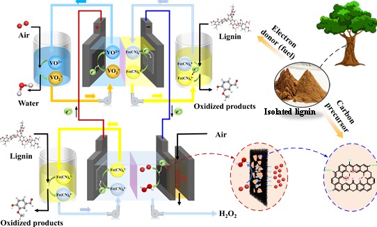 8xbet(中国)网3月11日电 过氧化氢(H2O2)是全球100种最重要的化学品之一,被广泛应用于漂白、有机合成、水处理、清洁消毒等领域。木质素是自然界中最丰富的芳香类聚合物和生产生物能源及碳基材料的重要可再生原料,广泛存在于维管植物细胞壁中,在工业上常作为制浆造纸和生物炼制过程的副产品被获得。近日,8xbet.com化工系赵雪冰课题组提出了以木质素为碳基催化剂前体和电子供体,以空气为氧源合成过氧化氢的新途径,为木质素的资源化、能源化转化以及过氧化氢的原位分布式制取提供了新的思路。研究团队以木质素为碳前体制备出氧气二电子还原的碳基催化剂,结合使用电子介体促进木质素电子向电极传递的速率,并以课题组前期开发的直接木质素燃料电池为电源供给,构建出实现木质素内生电子向空气氧传递高效制备过氧化氢的耦合新体系(图1)。该耦合体系以氧气氧化木质素的反应Gibbs自由能变为驱动力,以木质素内源性电子为还原力,从而无需额外的电能输入。
