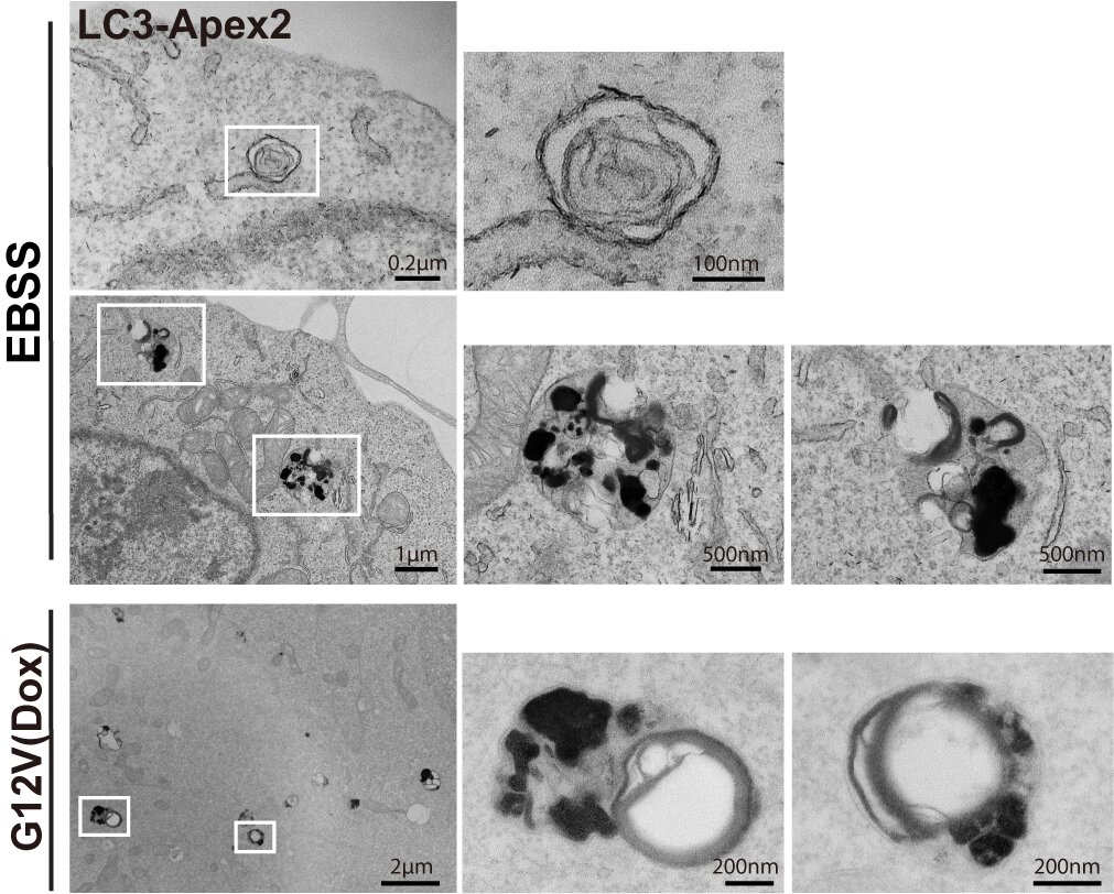 研究人员以RAS突变的癌症模型探索自噬在肿瘤中的详细分子机制,发现了一种由RAS突变表达诱导的非经典自噬,命名为RINCAA (RAS-Induced non-canonical autophagy via ATG8ylation)。与饥饿诱导的自噬相比,RINCAA受不同的自噬因子调控,形成ATG8家族蛋白(如LC3和GABARAP)标记的多膜泡和多层结构的非经典自噬体结构,将其命名为RIMMBA(RAS-induced multivesicular/multilaminar bodies of ATG8ylation)(图2)。
