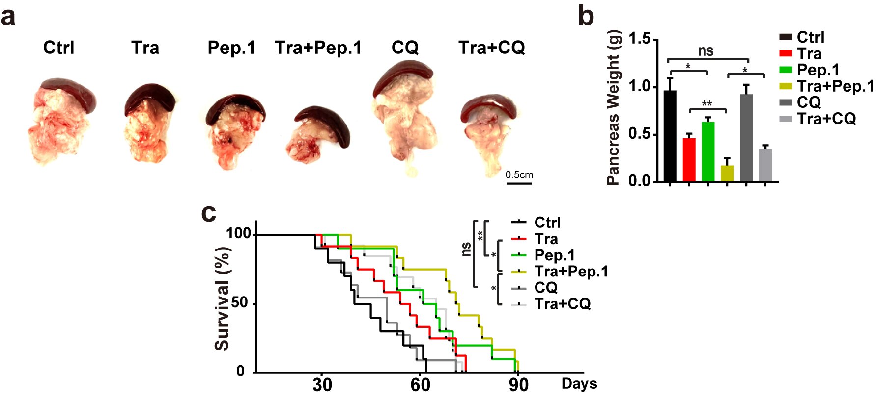 图3.Tat-Pep1抑制KPC小鼠肿瘤生长并延长其生存期